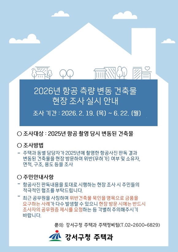 이번 조사는 서울시 공간정보과에서 제공한 항공사진 판독 결과를 바탕으로 지난해 대비 변동이 확인된 건축물을 대상으로 하며, 화재·붕괴 등 안전사고를 사전에 방지하고 쾌적한 도시 환경을 조성하기 위해 시행된다.