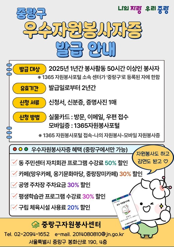 우수자원봉사자증 소지자는 중랑구 내에서 다양한 할인 혜택을 받을 수 있다. ▲동 주민센터 자치회관 프로그램 수강료 50% 할인 ▲카페(망우카페·옹기문화마당·중랑장미카페) 30% 할인 ▲공영주차장 주차요금 30% 할인 ▲평생학습관 프로그램 수강료 30% 할인 ▲구립 체육시설 사용료 20% 할인이 제공된다.