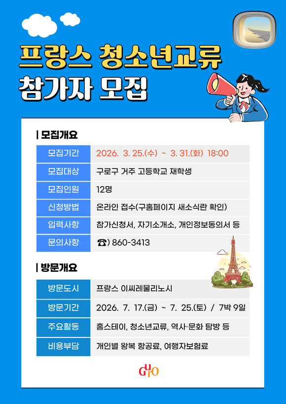 선발된 청소년은 7월 17일부터 25일까지 7박 9일 동안 구로구 자매도시인 프랑스 이씨레물리노시를 방문해 현지 가정 체험(홈스테이), 역사·문화를 체험하고 청소년 친교 활동 등을 펼칠 예정이다.