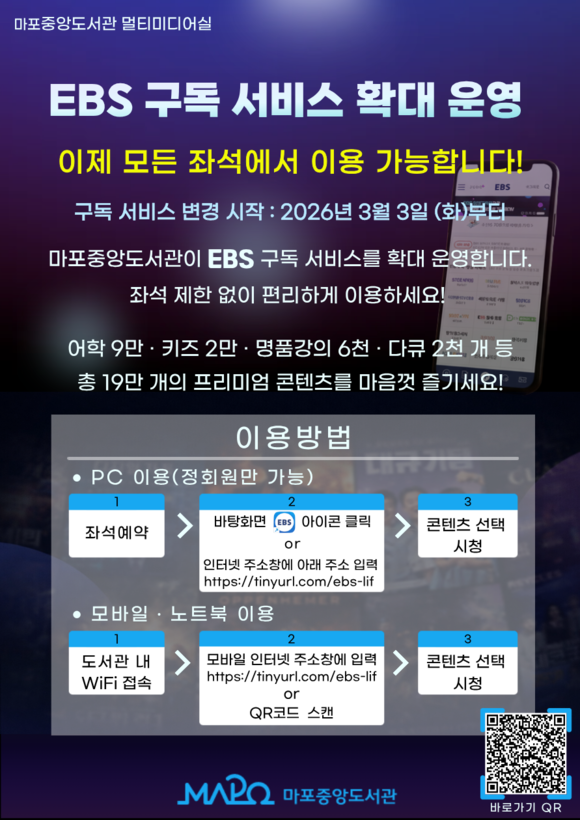 서울 마포구(구청장 박강수) 구립도서관인 마포중앙도서관은 이용자에게 편리하고 폭넓은 영상자료 서비스를 선보이기 위해 2026년 3월부터 ‘EBS Play+ 구독 서비스’를 확대 운영한다.