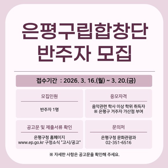 서울 은평구(구청장 김미경)는 오는 16일부터 20일까지 은평구립합창단 피아노 반주자 1명을 공개 모집한다고 밝혔다.