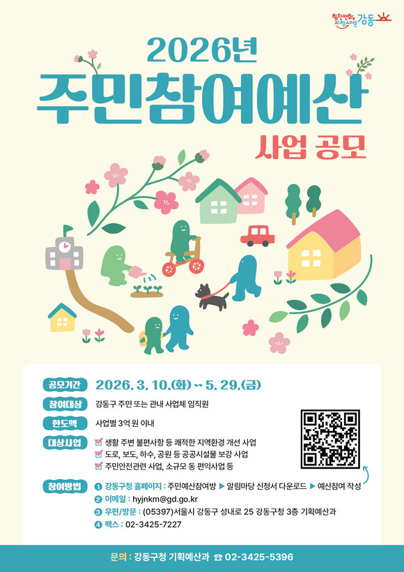 주민참여예산 주민제안사업 공모와 관련해 신청 서식 및 자세한 사항은 강동구청 누리집(참여소통→구정참여→주민예산참여방→알림마당)에서 확인할 수 있다.