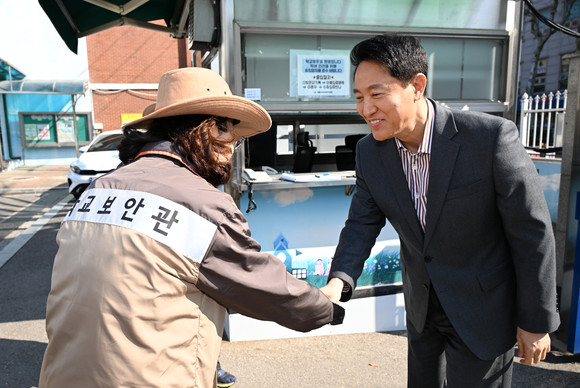 오세훈 서울시장이 13일(금) 서울 소재 초등학교에서 학교보안관과 인사를 나누고 있다. 사진=서울시청