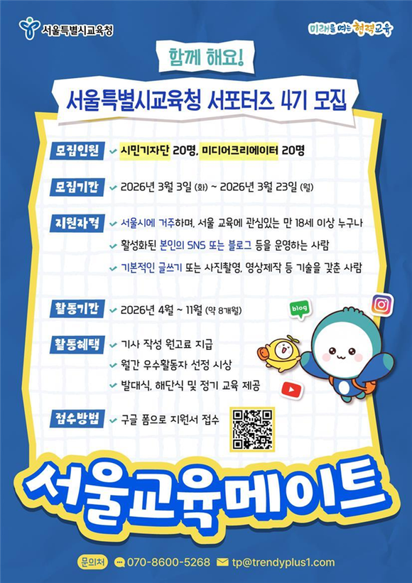 서울교육메이트(홍보 서포터즈) 4기 참여를 원하는 지원자는 3월 23일(월)까지 서울시교육청 공식 블로그에 방문해 구글폼즈로 지원서를 작성 및 접수하면 된다.