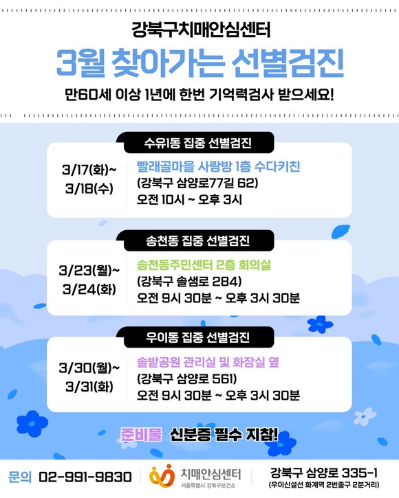 서울 강북구(구청장 이순희) 강북구치매안심센터가 지역 주민의 치매 조기 발견과 예방을 위해 3월 중 ‘찾아가는 집중 선별검진(기억력 검사)’을 운영한다.