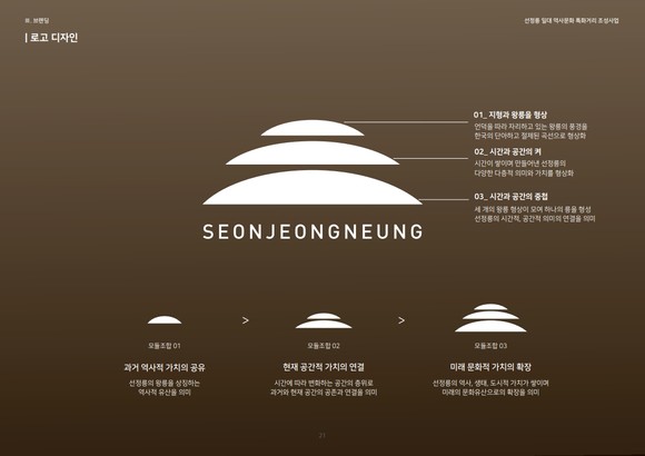 구는 먼저 선정릉의 정체성과 역사적 가치를 담은 선정릉 역사문화거리 브랜드를 개발했다. 브랜드 심볼은 겹겹이 포개진 세 개의 곡선 층으로 구성돼 있으며, 성종, 정현왕후, 중종의 세 능을 상징한다. 동시에 시간의 켜가 층층이 쌓인 역사적 중첩과 과거·현재·미래가 이어지는 확장성을 담고 있다. 간결하면서도 부드러운 곡선은 왕릉의 지붕선과 능선의 실루엣, 전통 기와의 선형을 연상시키며, 절제된 형태 속에 선정릉만의 품격과 현대적 감각을 함께 담아냈다. 이 디자인 언어는 상징 사인과 벤치 등 거리 시설물에도 일관되게 반영돼 통일감 있는 경관을 형성한다.