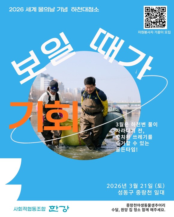 서울 성동구와 사회적협동조합 한강은 세계 물의 날(3월 22일)을 맞아 오는 3월 21일(토) 오전 10시부터 오후 1시까지 성동구 중랑천 일대에서 하천 대청소 자원봉사 활동을 진행한다고 밝혔다.