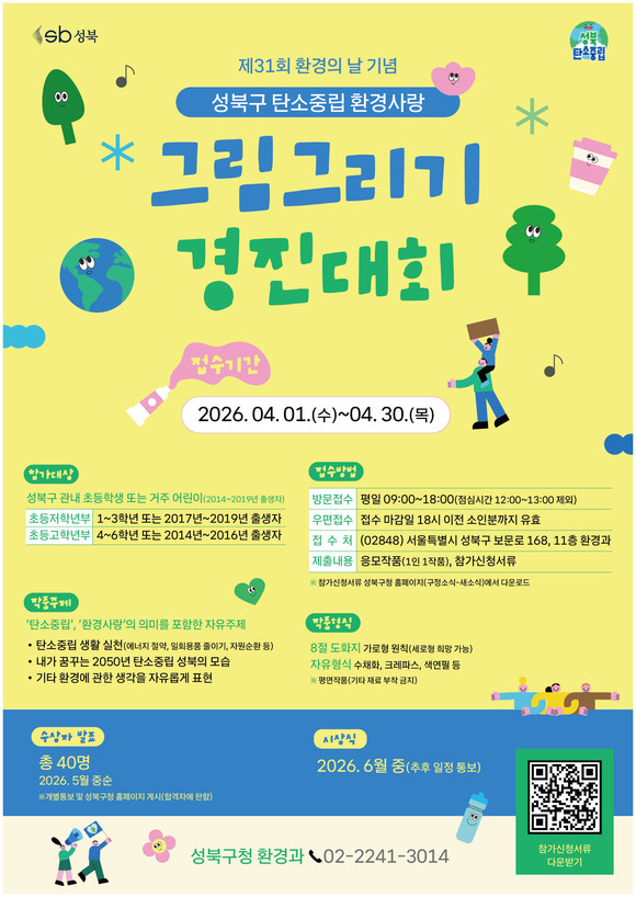 서울 성북구(구청장 이승로)가 제31회 환경의 날(6월 5일)을 맞아 ‘2026년 성북구 탄소중립 환경사랑 그림그리기 경진대회’를 실시한다.