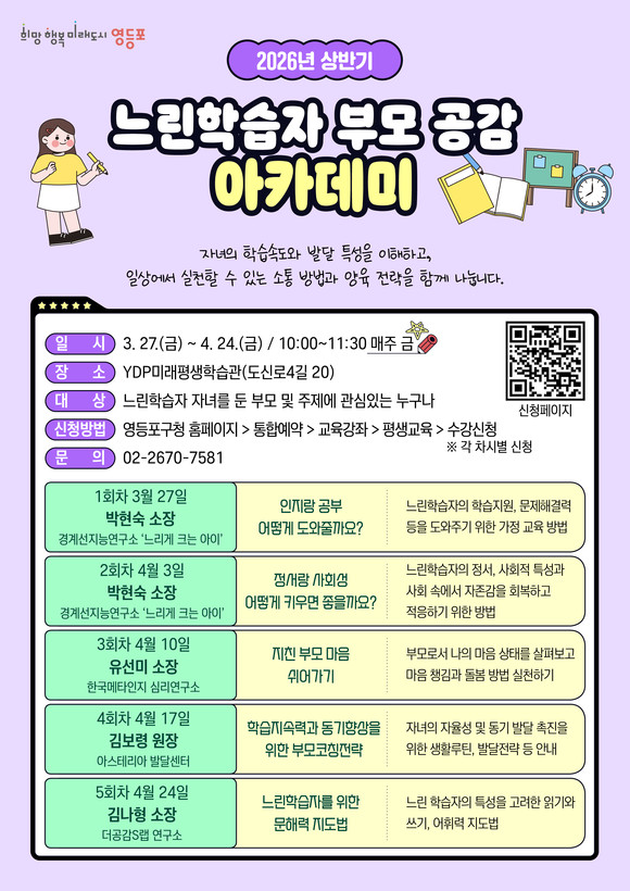 교육은 3월 27일부터 4월 24일까지 매주 금요일 오전, YDP미래평생학습관에서 총 5회에 걸쳐 진행된다. 느린학습자 자녀를 둔 부모는 물론, 관련 주제에 관심 있는 누구나 참여할 수 있다.