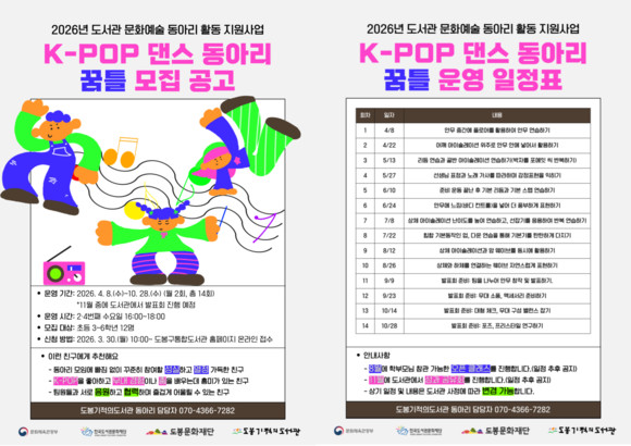 서울 도봉구(구청장 오언석) 도봉문화재단 도봉기적의도서관이 문화체육관광부와 한국도서관문화재단이 추진하는 ‘2026년 도서관 문화예술 동아리 활동 지원 사업’에 선정됐다.