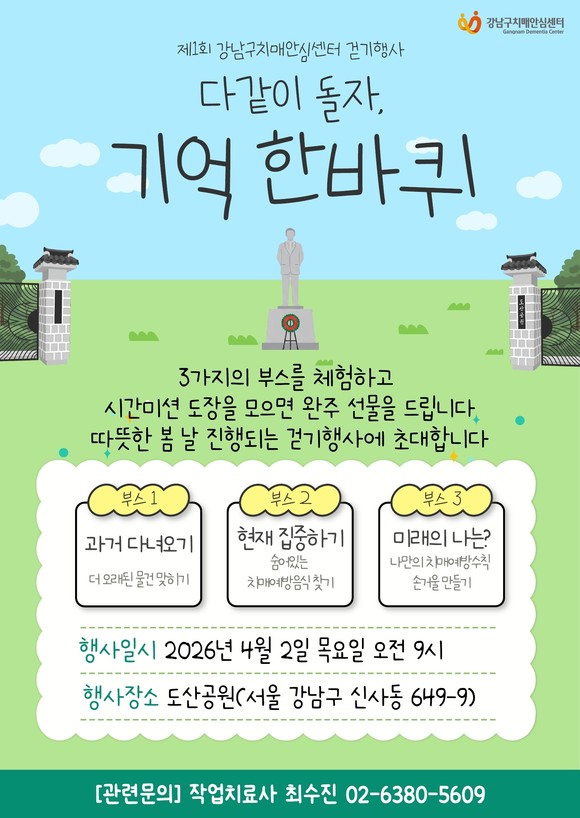 서울 강남구(구청장 조성명)가 4월 2일 오전 9시부터 낮 12시까지 도산공원에서 구민 100여 명과 함께 ‘강남구치매안심센터 걷기대회, 다같이 돌자, 기억 한바퀴’를 연다.