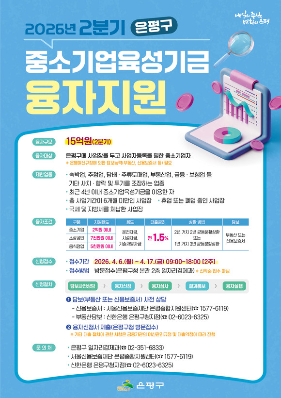서울 은평구(구청장 김미경)는 관내 중소기업과 소상공인의 경영 안정을 위해 15억 원 규모의 2026년 2분기 중소기업육성기금 융자를 시행한다고 밝혔다.