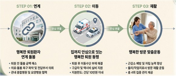 주요 내용은 ▲거동이 불편한 대상자를 위한 방문진료와 방문맞춤운동 ▲퇴원 후 돌봄공백 해소를 위한 퇴원환자 지역사회 연계 및 안심이동 ▲안전한 환경제공을 위한 주거환경 개선 등이다.