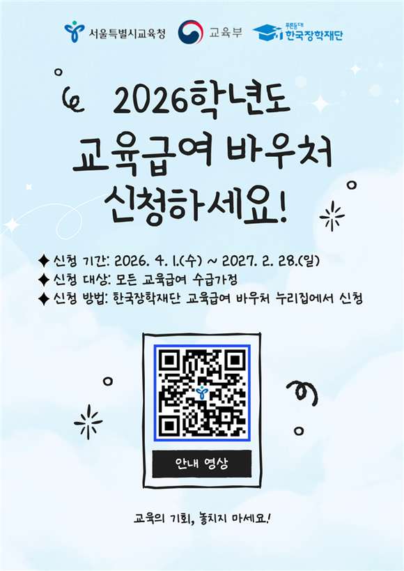 서울특별시교육청(교육감 정근식)은 저소득층 가정 학생들이 경제적 부담 없이 학업에 전념할 수 있도록 돕는 ‘2026학년도 교육급여 바우처’를 오는 4월 1일부터 내년 2월 28일까지 교육급여 바우처 전용 누리집에서 신청할 수 있다고 밝혔다.