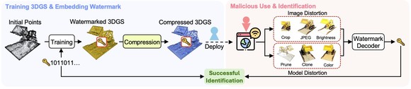 3DGS(3D Gaussian Splatting)는 실물에 가까운 고화질 영상을 실시간으로 생성하는 3D 표현 기술이다. 모델 용량이 커 저장·전송을 위해 압축이 필수적인데, 디지털 자산 내부에 소유권 정보를 삽입해 저작권자를 식별하는 기존 워터마킹 기술은 압축 시 정보가 손상되는 한계가 있었다.