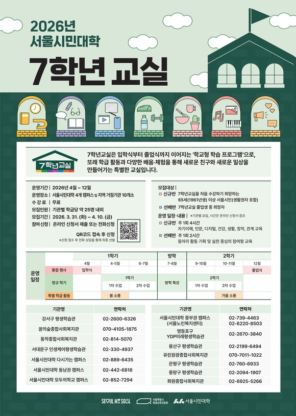 서울 서대문구(구청장 이성헌)가 오는 4∼12월 관내 65세 이상 어르신을 대상으로 평생교육 프로그램인 ‘7학년 교실’을 운영한다. 서울특별시 평생교육진흥원 공모에서 최종 선정돼 해당 기관과 협력 추진한다.
