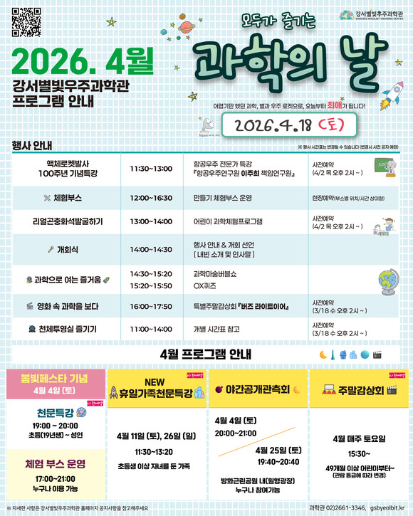 서울 강서구(구청장 진교훈) 강서별빛우주과학관(관장 심재현)은 ‘과학의 달’ 4월을 맞아 온 가족이 함께 즐길 수 있는 과학 체험 행사와 천문 프로그램을 운영한다.