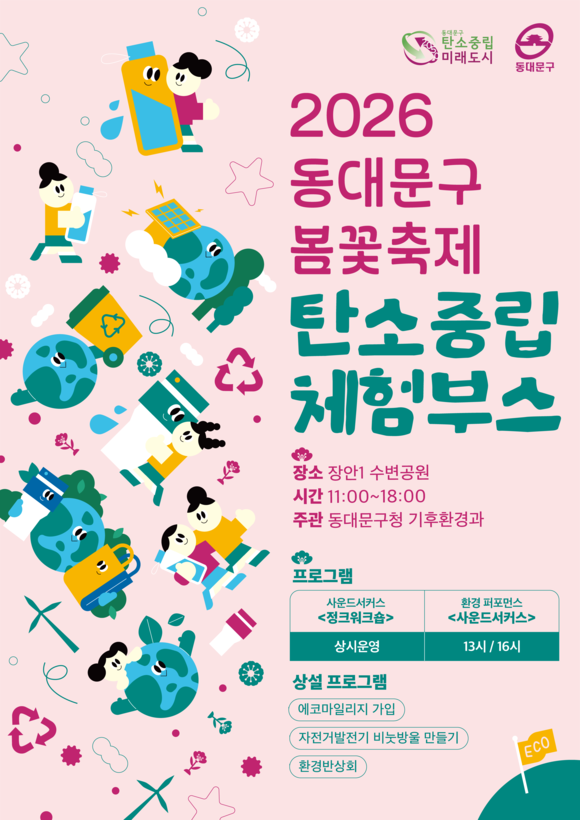 서울 동대문구(구청장 이필형)는 4월 4일부터 5일까지 장안1수변공원에서 열리는 ‘2026 동대문구 트로트축제×봄꽃축제’에서 탄소중립 체험부스를 운영한다고 밝혔다.