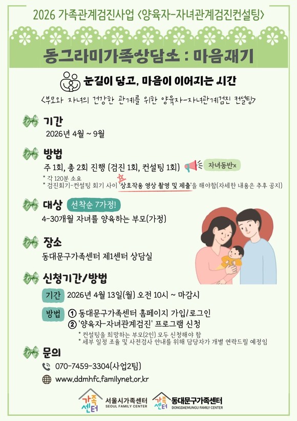 서울 동대문구(구청장 이필형)는 건강한 가족관계 형성과 의사소통 증진을 위해 ‘2026 가족관계검진사업’을 본격 운영한다고 밝혔다.
