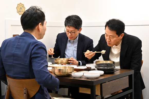 오세훈 서울시장이 8일(수) ‘통쾌한 한끼’ 인증 식당에서 잡곡밥 정식을 먹으며 이야기 나누고 있다. 사지=서울시청