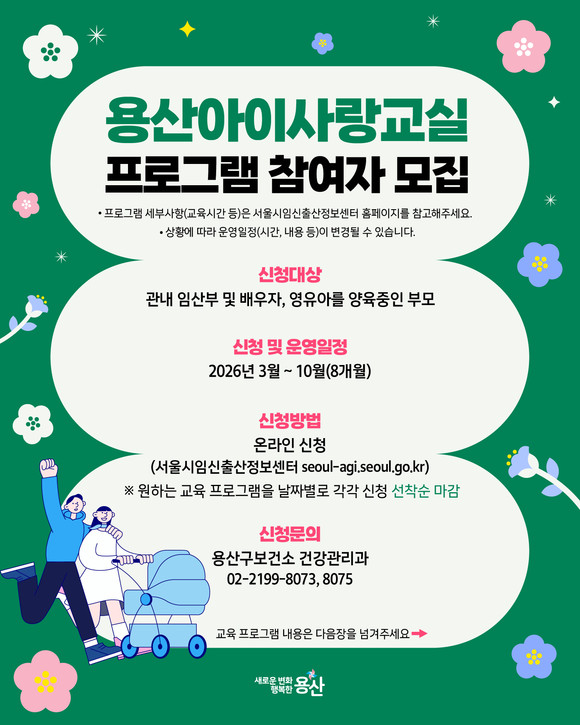 지원 대상은 용산구에 거주하는 임신부와 출산가정이다. 신청은 서울시 임신출산정보센터 누리집을 통한 온라인 사전예약으로 가능하며, 프로그램별 세부 일정은 용산구보건소 누리집 내 보건사업안내>모자보건사업>모자보건 교육프로그램에서 확인하면 된다.